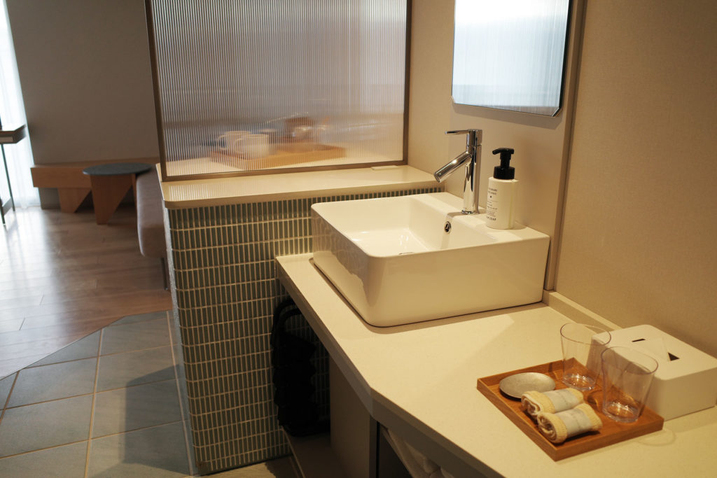エントランスを入るとすぐに目に入ったのは、素敵な洗面スペースと、やさしいブルーグリーンが印象的なタイル。
